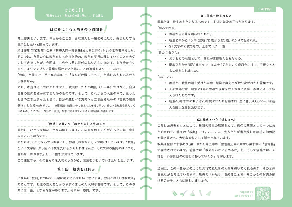 これから「教典きょうてん」について、一緒いっしょかんがえていきたいとおもいます。教典きょうてんとは『天理教教典てんりきょうきょうてん』のことです。おみちおしえをかりやすくまとめた大切たいせつ書物しょもつです。そして、この教典きょうてんには「もと」となる存在そんざいがあります。それが「原典げんてん」です。